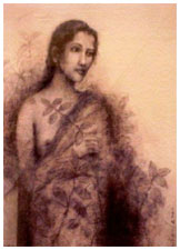 SUHAS ROY: He studied at the Indian College of Arts and Draftsmanship,Calcutta, and under the tutelage of Prof. S.W. Hayter at the Atelier 17 Ecole Superior Des Beaux Arts, Paris. His works have been exhibited allover the world through exhibitions like the Asian Graphic Prints Traveling Exhibition, USA, the Tokyo Print Biennale, Japan, Contemporary Indian Art,Yugoslavia, Romania, Czechoslovakia, Hungry, and Wounds, at the Central Institute Modern Art, New Delhi, and the National Gallery of Modern Art, New Delhi. Roy lives and works in Santiniketan where he is the head of the Department of Painting at Kala Bhavan, Santiniketan. His craftsmanship and consummate skill that ensure that his richly romantic subjects do not touch extreme syrupy and stereotypical portrayals. Instead, their very patent beauty veers towards melancholic grace and elegance. This graceful portrayal of his subjects has much to do with his choice of refinement. The mystical flavour of his works arose from his materials - his crayons, charcoal and brush have sensitivity and interpretations of the 'unknown'.